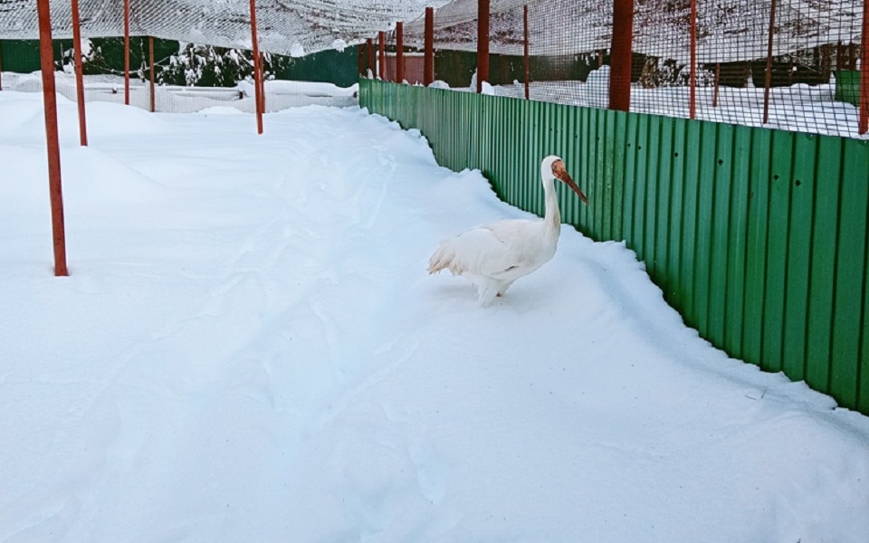 На земле в вольерах скопился почти метр снега. Он не дает возможности журавлям совершать прогулки, хотя температура на улице позволяет выпустить птиц на свежий воздух.