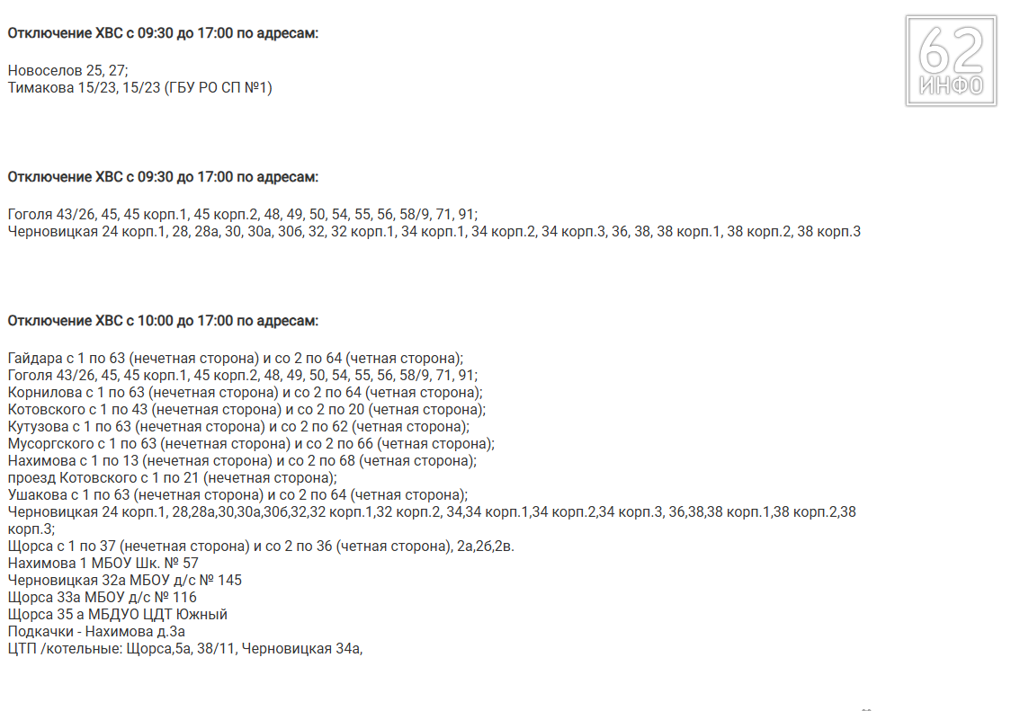 В списке на среду - десятки адресов. В основном это жилые дома, расположенные в Дашково-Песочне и Горроще (полный перечень ниже). Из социальных объектов без воды остались школа № 57 на улице Нахимова и детсады №№ 145 и 116.