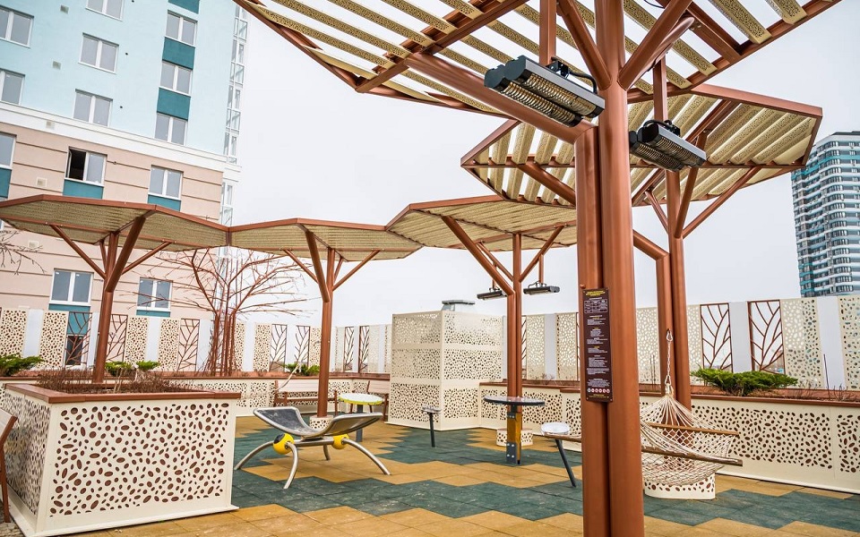 Любите гулять весной? Прохладные дни больше не нарушат ваши планы! На стилобате ЖК «Еврокласс-4» установлены навесы с инфракрасными обогревателями, которые подарят большим и маленьким жильцам дополнительное тепло.