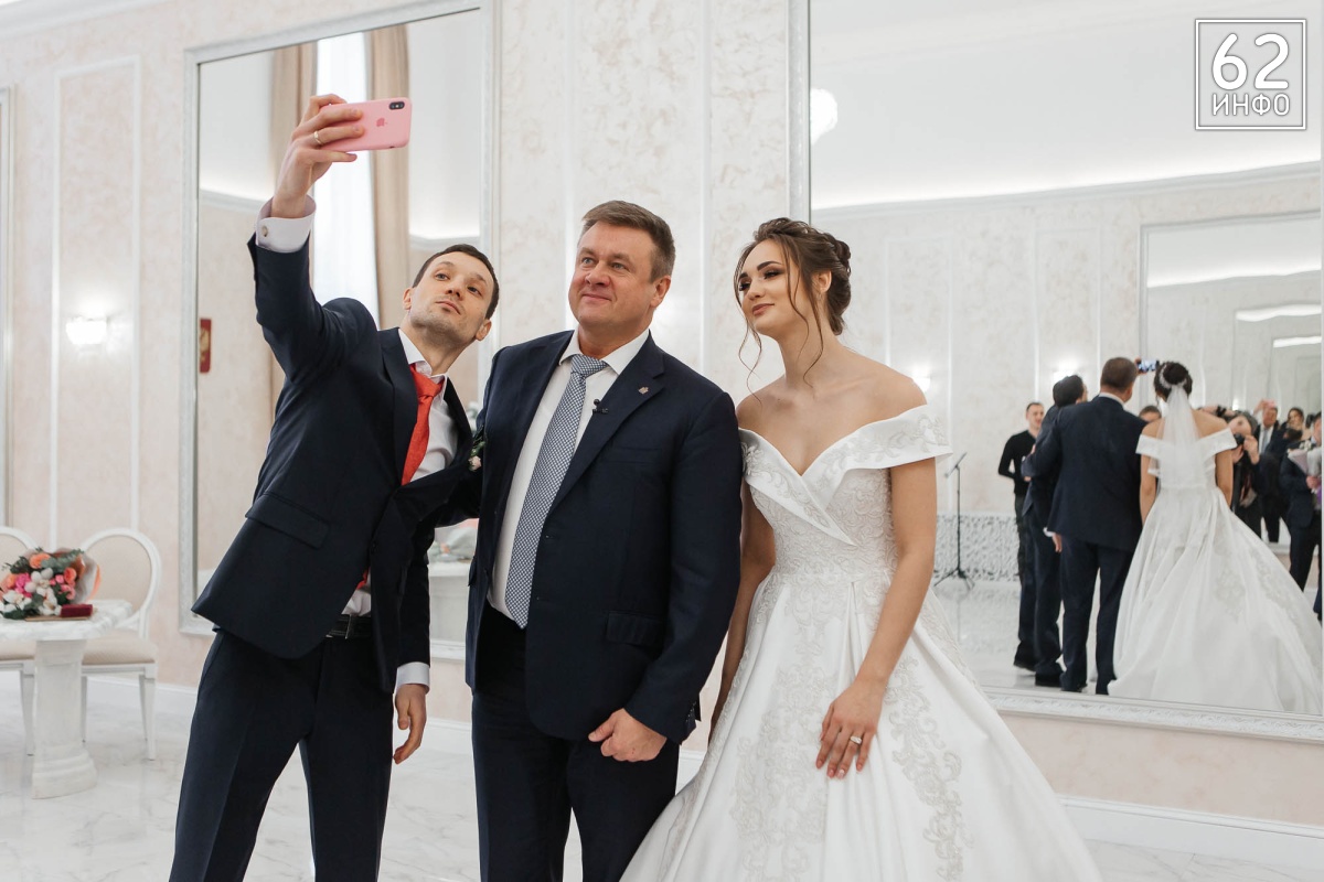 Губернатор подарил паре кулоны с символами святых Петра и Февронии. После церемонии жених и невеста сделали с ним селфи.