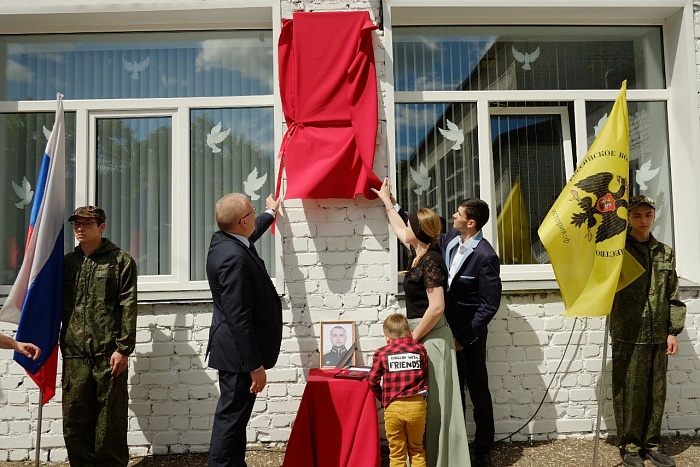 Мемориальную доску разместили на здании школы, где учился Денис Ягидаров. Присутствовала семья, ч том числе вдова и двое сыновей погибшего.