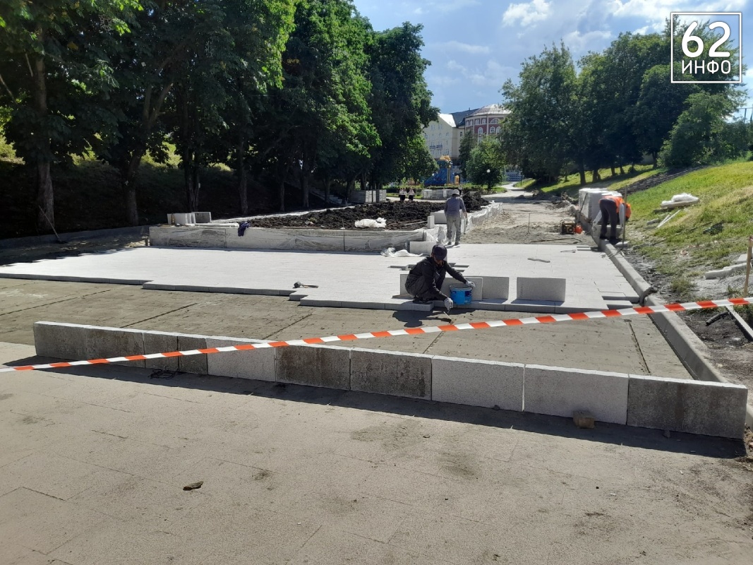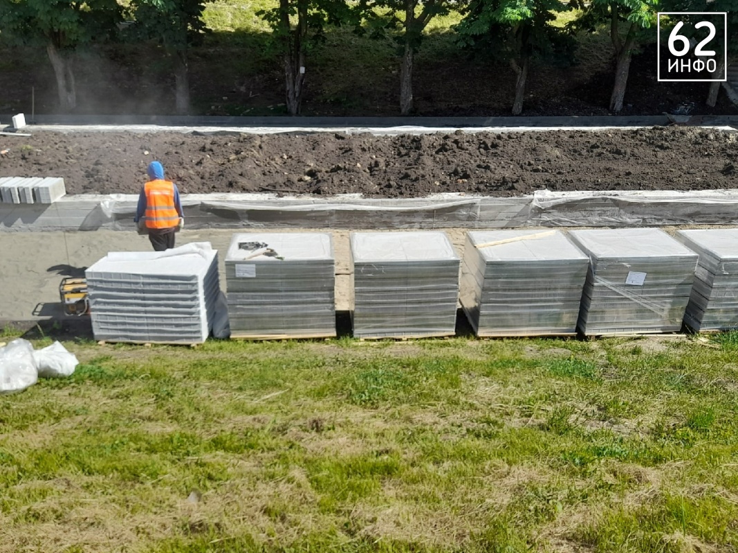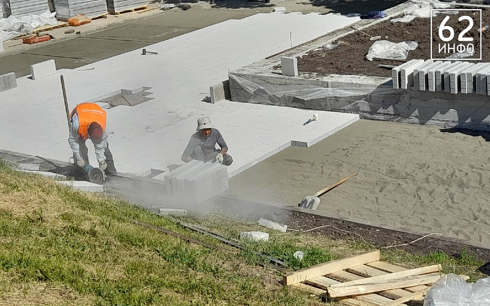 В текущий момент ремонт проходит на территории, которая располагается около Главпочтамта. Рабочим предоставили бетонные блоки, которые они в ходе своей работы распиливали камнерезной пилой.