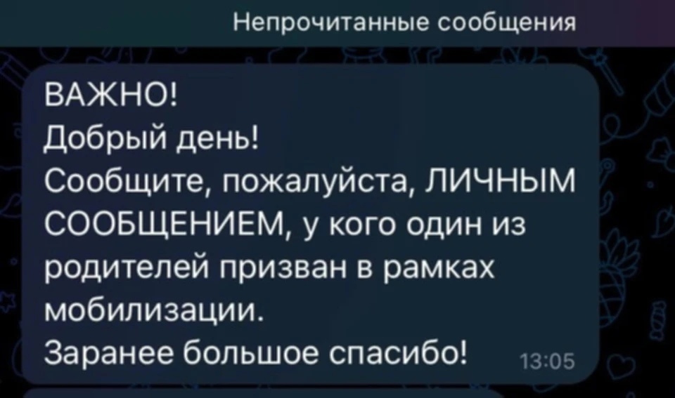 «Сообщите, пожалуйста, личным сообщением, у кого один из родителей призван в рамках мобилизации. Заранее большое спасибо!» - говорится в одном из таких сообщений.