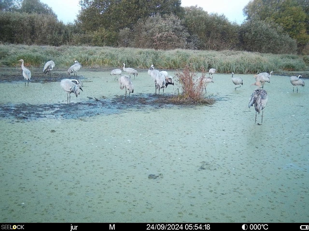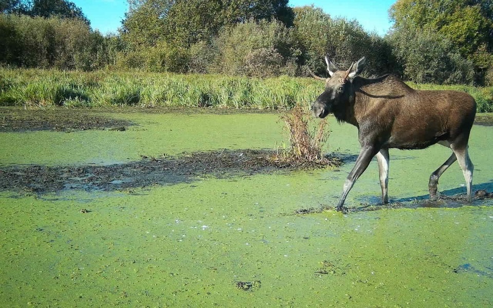 Птицы гнездятся на одном из пересыхающих небольших озер. Здесь журавли отдыхают перед перелетом. Для наблюдения за пернатыми у водоема установили фотоловушку – но на одном из сделанных ею снимков неожиданно нашли лося.