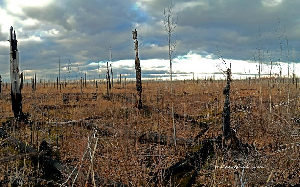 На снимках до горизонта простирается пространство, заполненное остатками стволов деревьев. Многие еще держатся вертикально, часть лежит на земле. На коре и обугленной древесине видны черные следы, оставленные огнем.