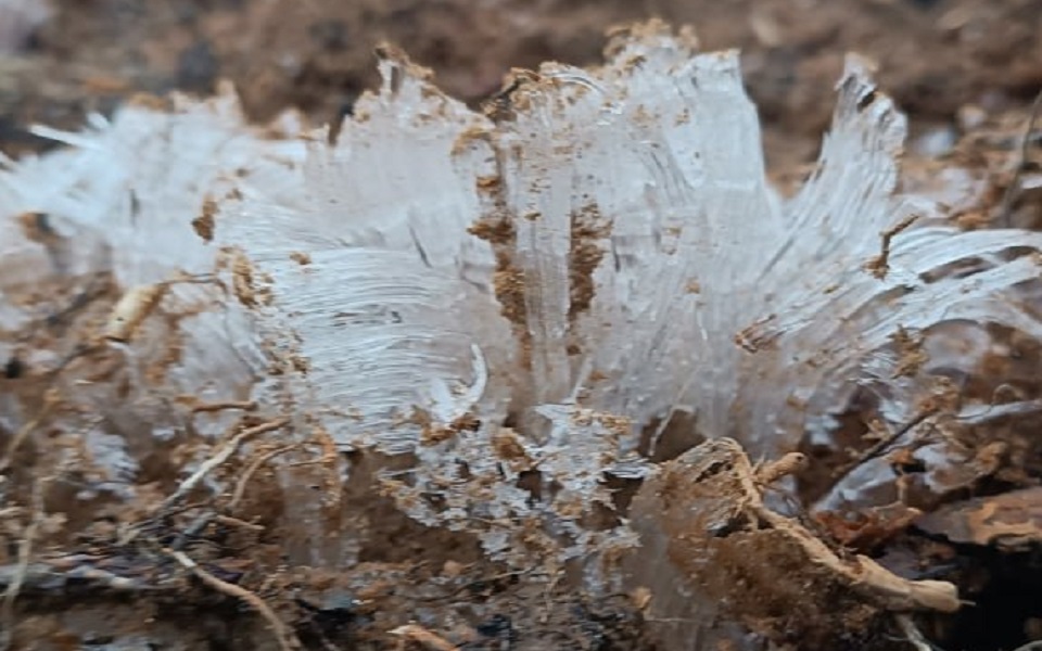 Необычные ледяные «цветы» растут из мокрого песка в глубине мещерских лесов.