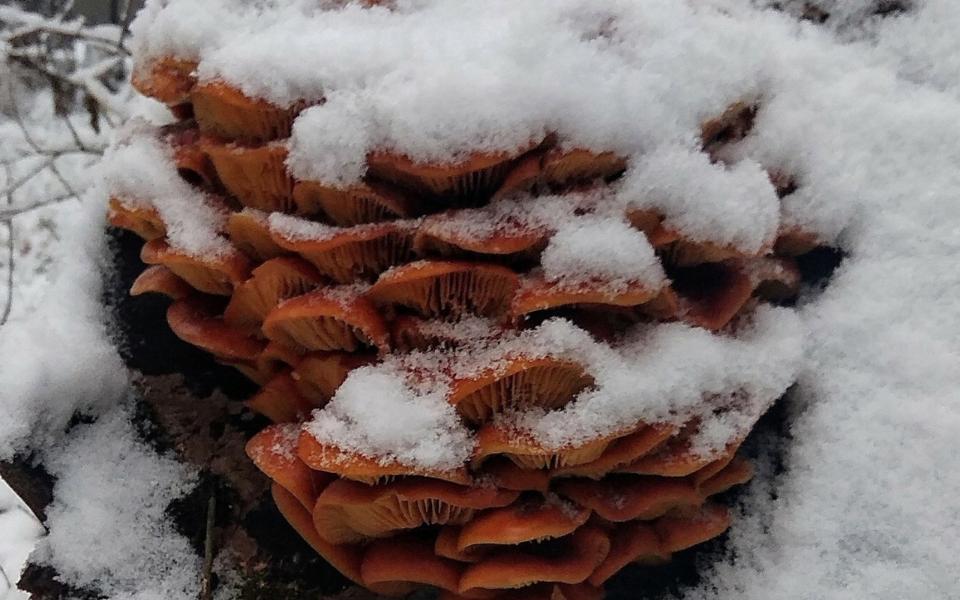 Сейчас в лесах растут фламмулины, или «зимние опята». Найти их можно на повреждённых деревьях и мёртвой древесине, они съедобные и растут в большом количестве. Автор фотографии обнаружил грибы 7 января, на Рождество, и решил их пожарить.
