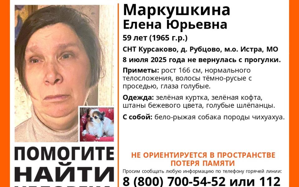 Женщина живёт в СНТ Курсаково в деревне Рубцово. 8 июля она вышла погулять с бело-рыжей чихуахуа и не вернулась.
