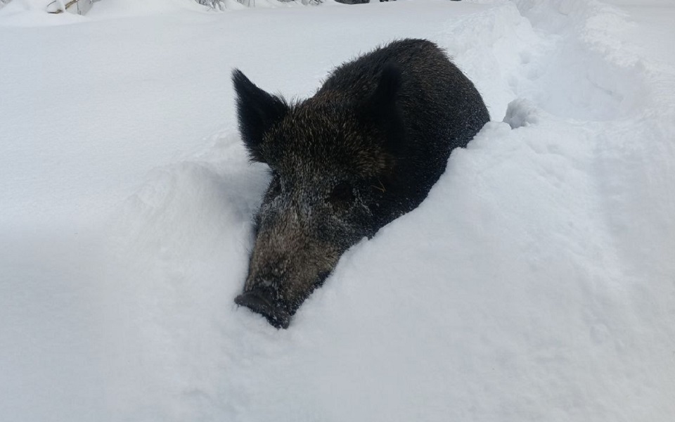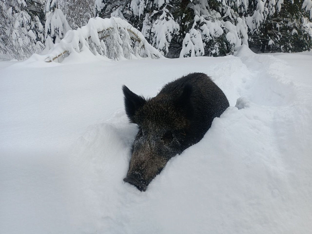 Она отметила, что для нынешней зимы это очередной рекорд, и сопроводила пост фотографиями кабанов, уверенно прокладывающих тропинки по уши в снегу.