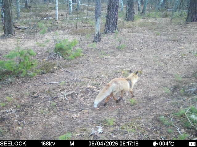 Запечатлела камера кабана - он несколько кокетливо выглядывает из-за дерева. Попала в кадр и лиса, бодро бегущая по своим делам.