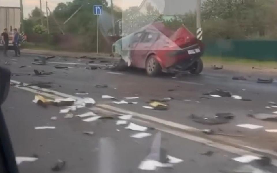 Легковушка получила сильные повреждения, на дороге лежат её множественные запчасти. Сильно пострадала лобовая часть автомобиля. Машину в результате ДТП почти «смяло».