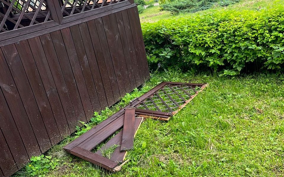На фото видно, что вырваны туи и частично сломана деревянная беседка.