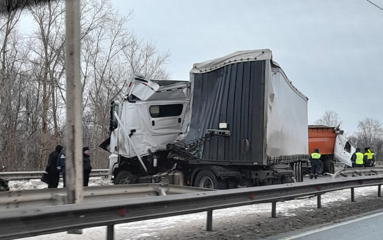 Судя по кадрам, столкнулись самосвал и фура. О пострадавших не сообщалось. Подробности уточняются.