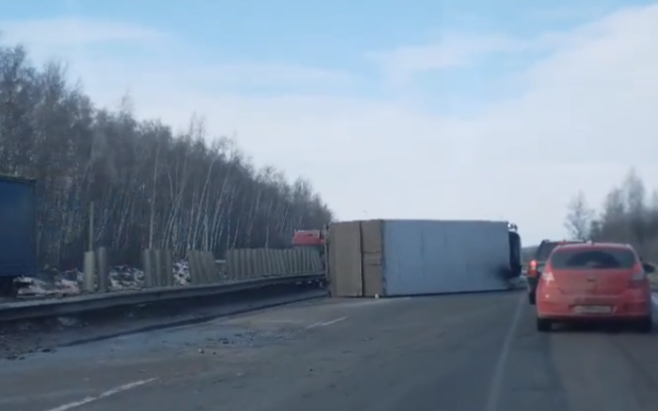 Авария произошла в пятницу, 8 марта. Судя по , автомобиль задел разделительное ограждение. Большегруз лежит на боку, перегородив две полосы для движения.