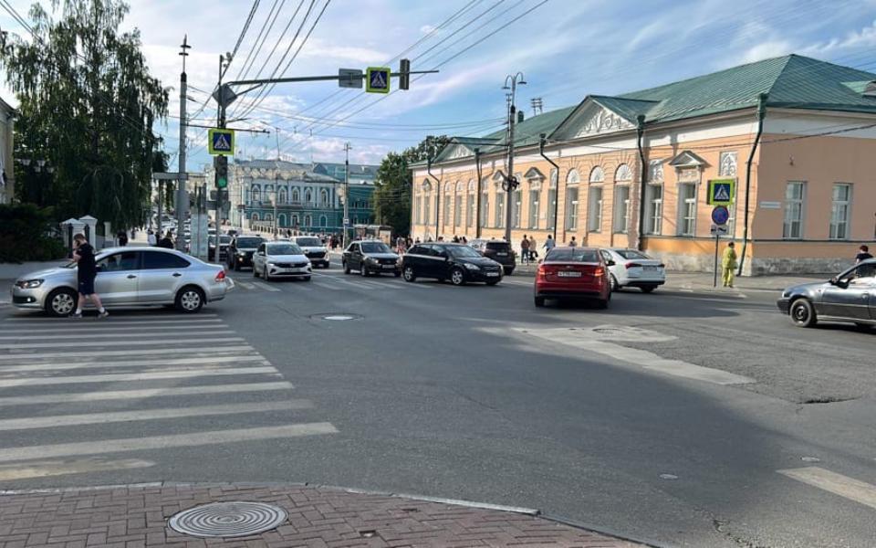 В понедельник, 24 июня, в центре Рязани столкнулись легковушки. Фото с места происшествия было опубликовано в паблике «Автоблог Рязани».