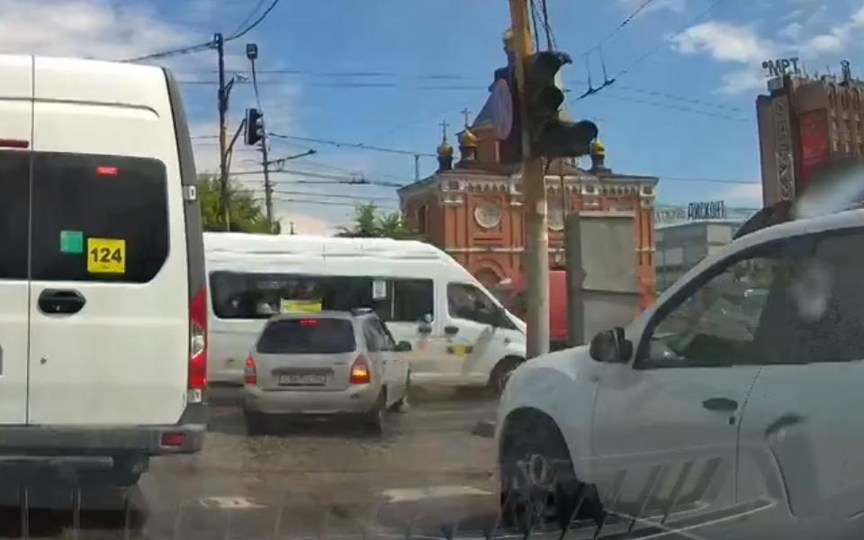 В среду, 26 июня, в Рязани у светофора столкнулась маршрутка и легковушка. Видео с места происшествия опубликовано в соцсетях.