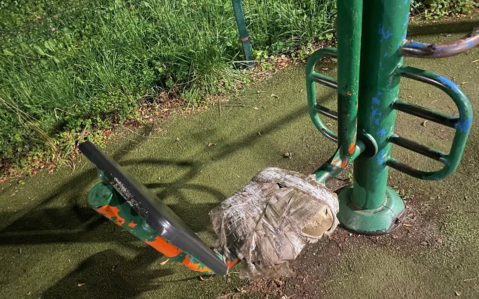 На кадрах видно, что уличные тренажеры сломаны. Кое-где их пытались починить, как могли - например, разбитое сиденье перемотано скотчем. Однако заниматься на таких тренажерах может быть небезопасно.