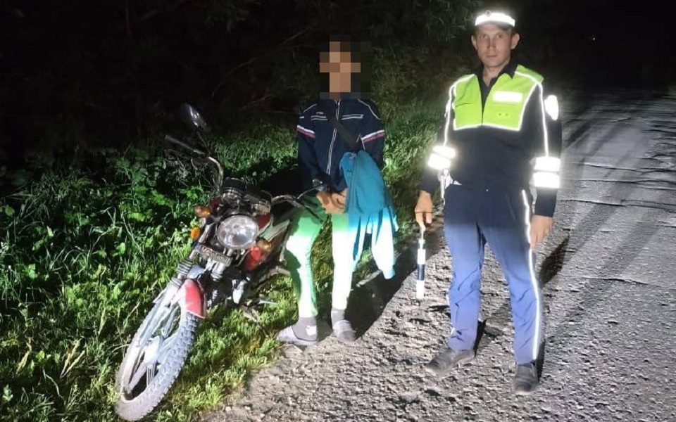 14-летний подросток ехал на мопеде по селу Канино - права на управление им у него не было. Возможно, парень считал, что ему поможет уже наступившая темнота - но нарушителя все же заметили.