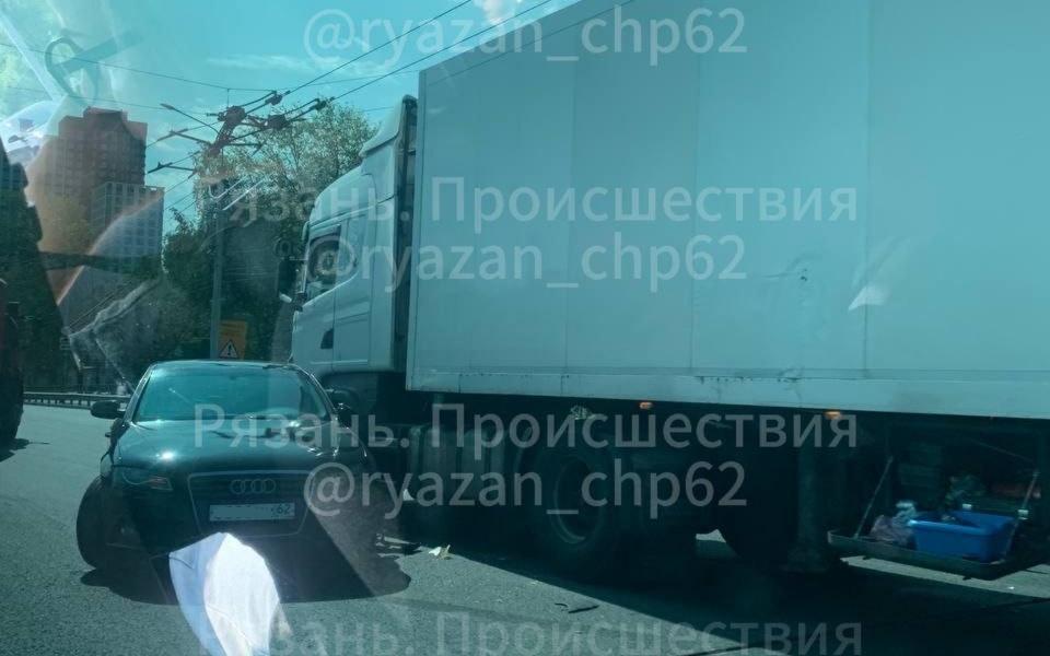В понедельник, 19 августа, в Рязани произошла авария между фурой и легковушкой. Фото с места происшествия опубликовано в телеграм-канале «Рязань. Происшествия».