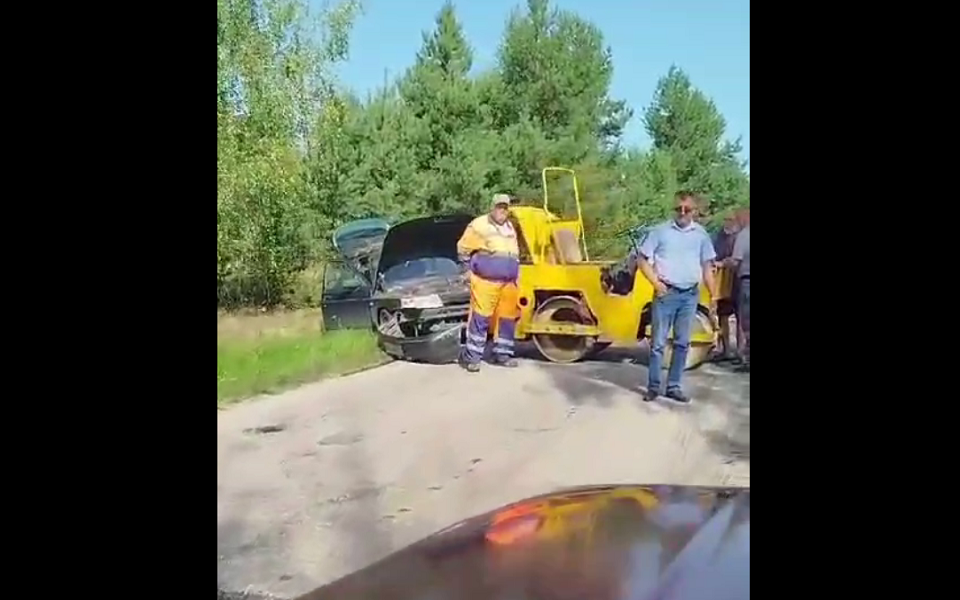 Вероятно, авария произошла неподалеку от райцентра. Легковой автомобиль с разбитым капотом лежит в кювете, поперек дороги развернут асфальтоукладочный каток.