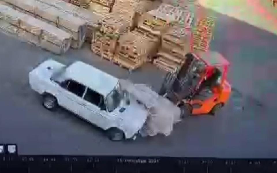 На кадрах видно, что авария произошла ну углу здания: погрузчик медленно поворачивал, пока легковушка на неосторожной скорости двигалась прямо. Машины столкнулись.