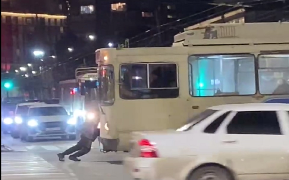 В Рязани мужчина освободил пешеходный переход от слишком приблизившегося к нему троллейбуса.