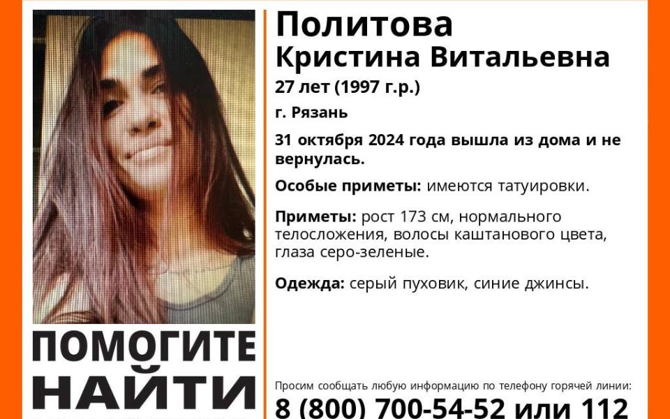 Спасатели ищут Кристину Политову 1997 года рождения. Она исчезла в 31 октября 2024 года — вышла из дома и не вернулась.