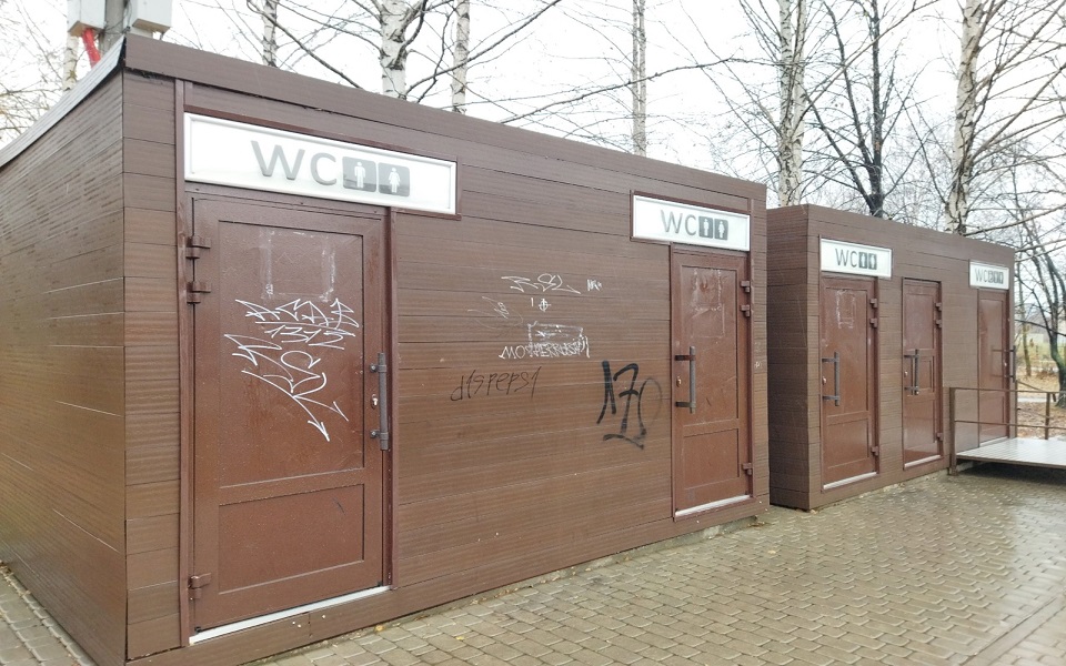Фото туалетов снаружи и внутри опубликовала группа "Рязанский формат" во ВКонтакте. Снаружи стены туалетов покрыты граффити и рекламой наркошопов.