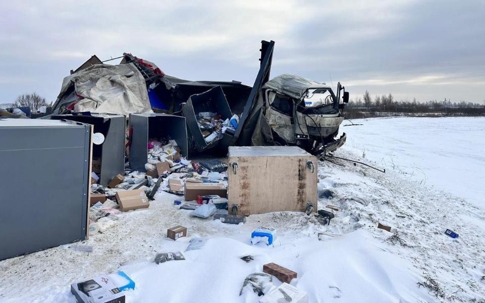 На кадрах видно, что грузовик вылетел с трассы, повсюду разбросаны контейнеры с товарами, салон автомобиля смят.
