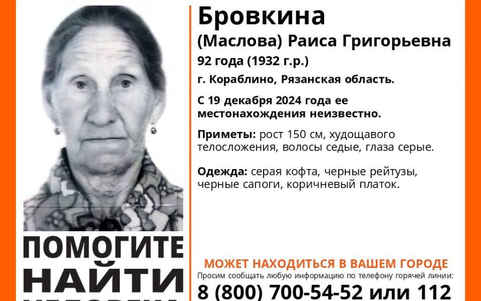Поисково-спасительный отряд «ЛизаАлерт» объявил о начале поиска Раисы Бровкиной, пропавшей 19 декабря. Подробности опубликованы в соцсетях добровольцев.