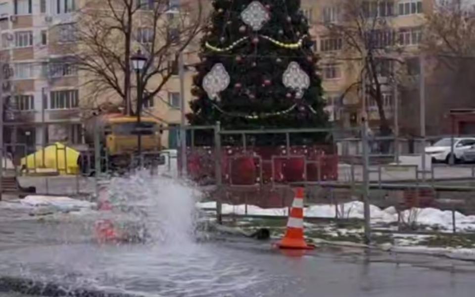 На ролике видно, как из земли бьёт «гейзер» рядом с наряженной ёлкой. Вокруг места инцидента выставлены ограничивающие знаки.