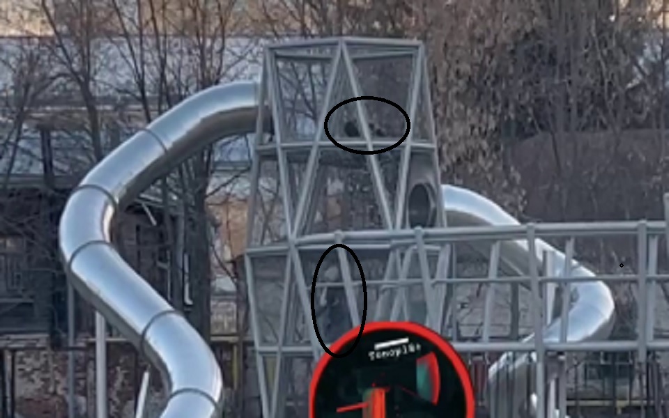 В ролике видно, что один из школьников забрался на верхний ярус металлической конструкции, другой находится на «втором этаже».