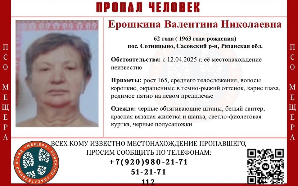 По информации волонтеров, данных о местонахождении Валентины Николаевны Ерошкиной нет с 12 апреля. Она из поселка Сотницыно Сасовского района.