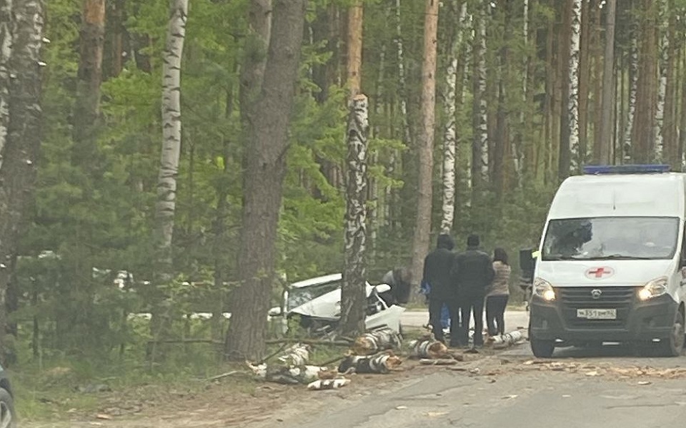 На снимке видно, что отечественную легковушку буквально разнесло о дерево. Машина разбита, береза почти снесена - рядом заметны обломки.