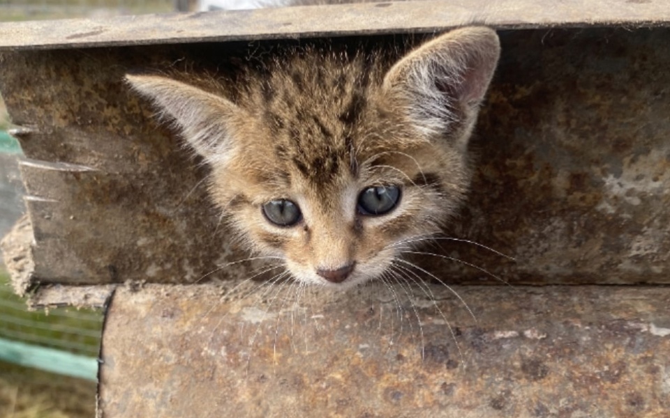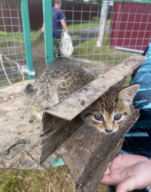 Волонтеры-спасатели пришли на помощь котенку, голова которого застряла в отверстии в металлической детали.