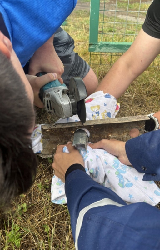 Зверька извлекали с помощью болгарки, стараясь действовать как можно более осторожно, чтобы его не ранить. Операция прошла успешно: котенка достали и передали автору заявки.