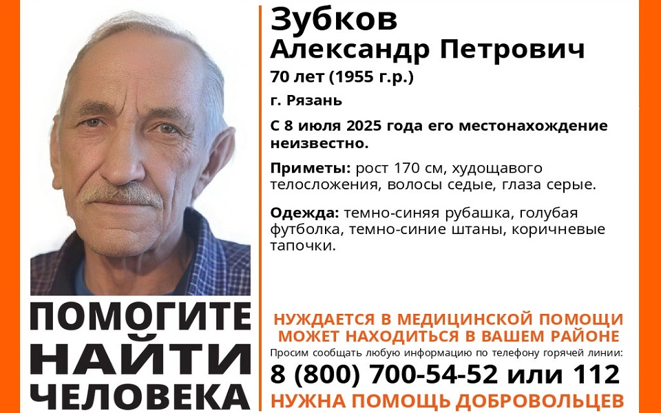 В ориентировке от "ЛизаАлерт" говорится, что Александр Петрович Зубков потерялся 8 июля. Пропавшему мужчине 70 лет.