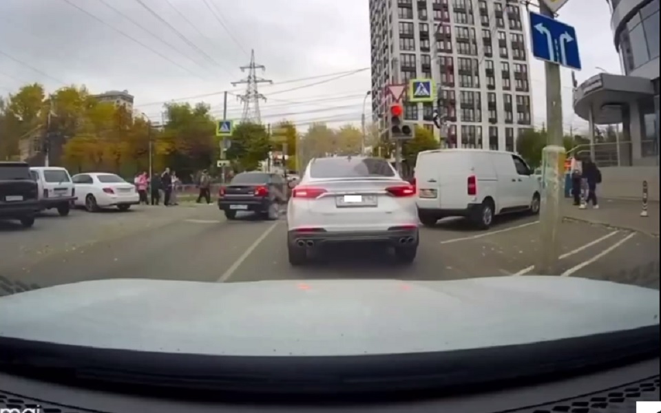 На кадрах видно, как внедорожник на большой скорости пересекает переход уже после того, как для пешеходов включился зеленый свет и группа людей пошла через проезжую часть.