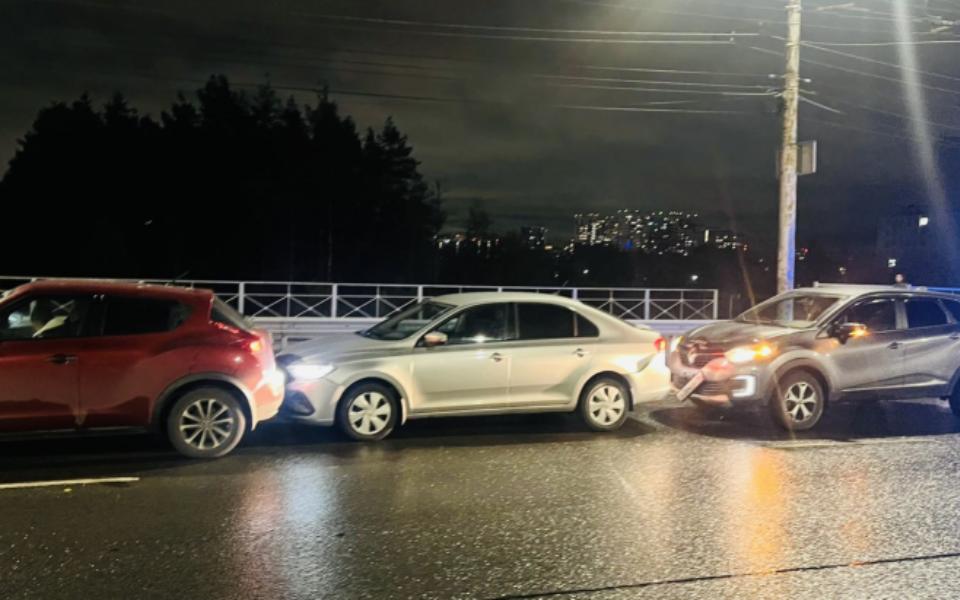 Авария произошла в 19:35 у дома № 65 на улице Октябрьской. 45-летний рязанец на Renault врезался в двигающийся попутно Volkswagen под управлением 30-летней местной жительницы. В результате удара Volkswagen по инерции впечатало в стоящий впереди Nissan под управлением 22-летней рязанки.