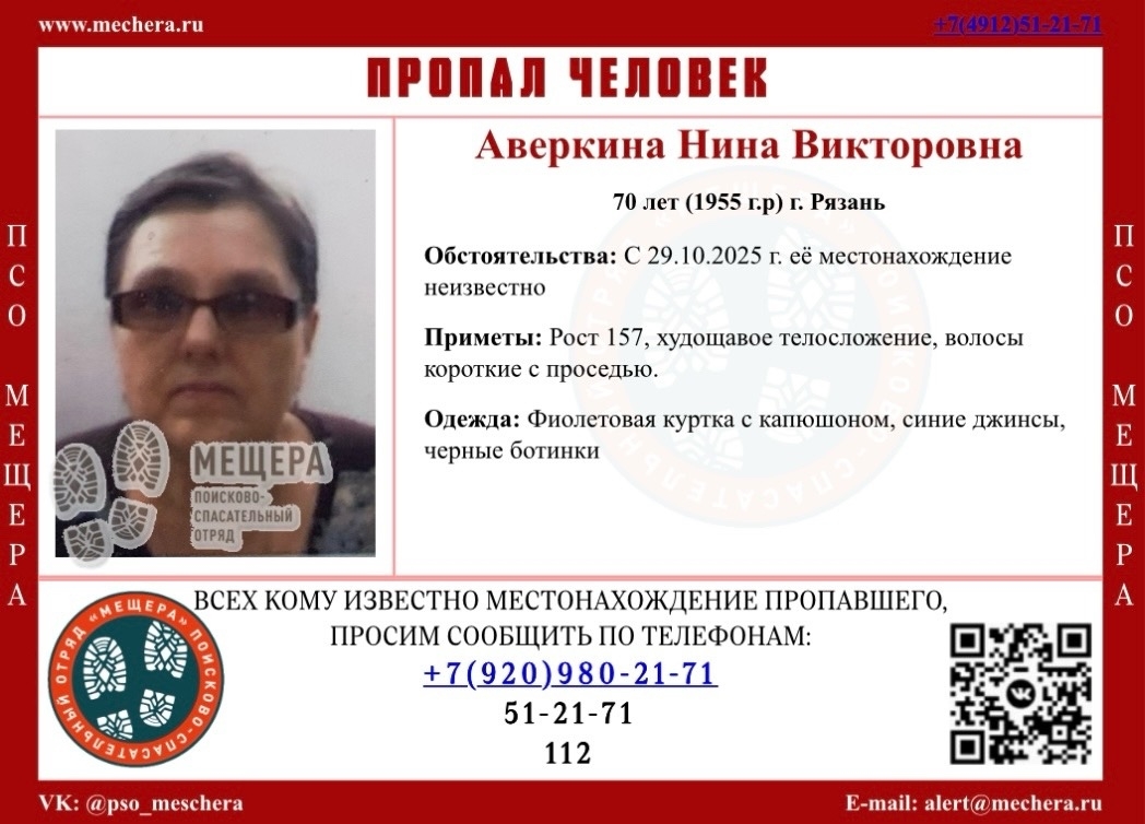 Приметы пропавшей: невысокая (157 см), худощавая, короткие волосы с проседью.