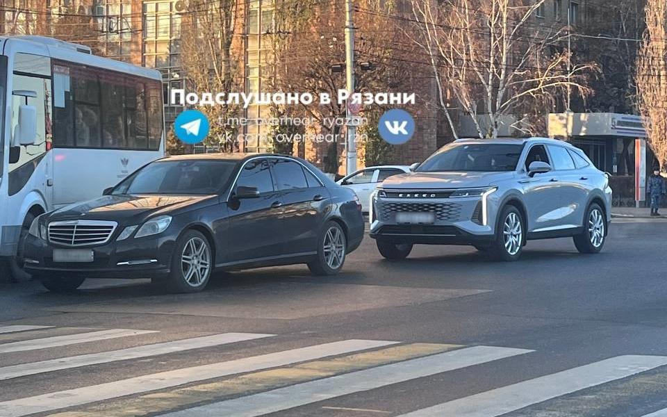 В центре Рязани произошла авария между как минимум двумя легковушками. Фото с места аварии опубликовано в телеграм-канале «Подслушано в Рязани».