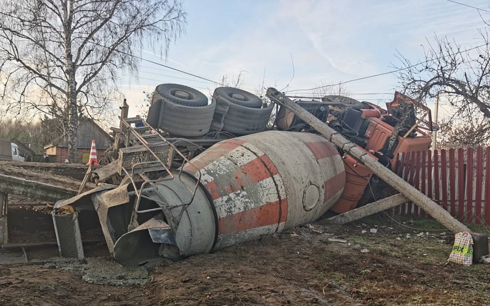 Машина завалилась - она была припаркована у обочины. В итоге бетономешалка упала в сторону домов. Поврежден забор, оборваны провода, рухнула опора ЛЭП.