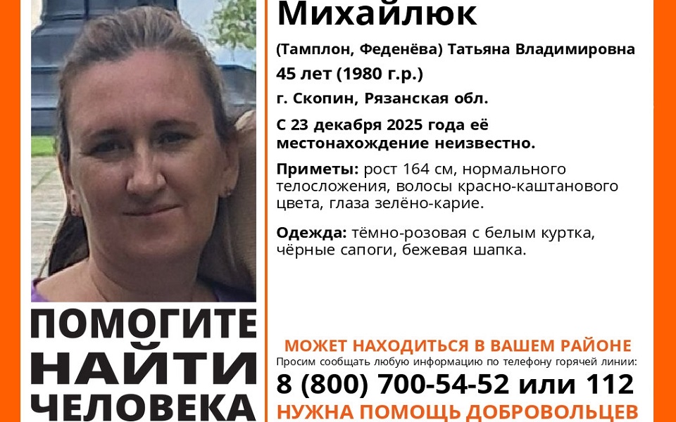 Татьяне Владимировне Михайлюк (Тамплон, Феденевой) 45 лет. Ее ищут с 23 декабря.