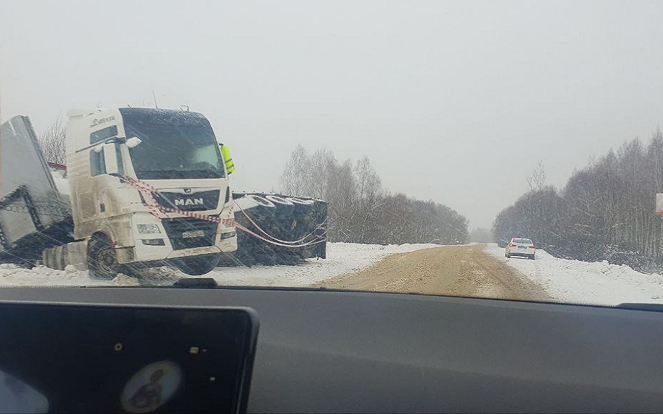 Большегруз MAN опрокинуло и развернуло поперек трассы, из-за чего дорога оказалась перекрыта. Авария случилась неподалеку от деревни Кошибеевка.
