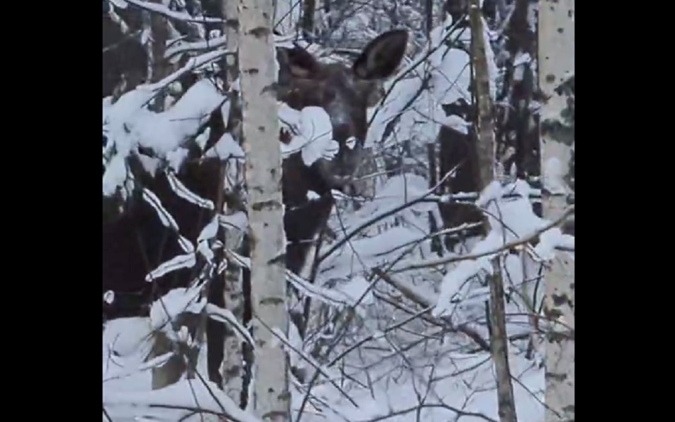 На видео лось ведет себя спокойно, гуляет среди берез, периодически взглядывая в сторону оператора.