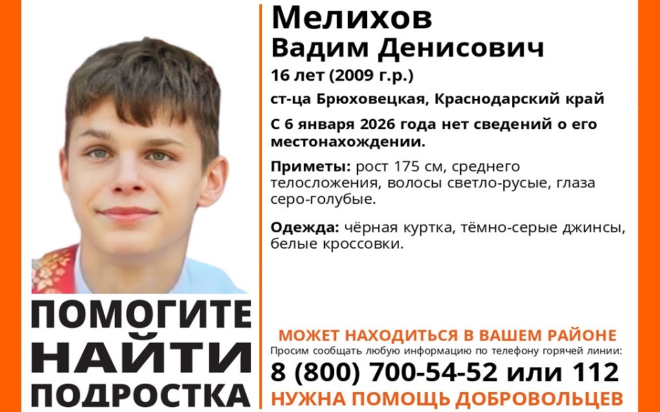 Вадиму Мелихову 16 лет, он из Краснодарского края, станицы Брюховецкая. Сведений о мальчике нет с 6 января. У поисковиков есть основания полагать, что пропавший может быть в нашем регионе.