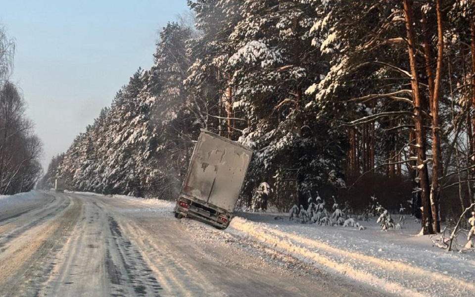 Большегруз съехал с проезжей части, фура чудом не опрокинулась в кювет. На фото видно, что дорога покрыта льдом и накатанным снегом.