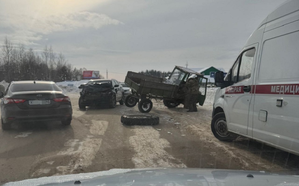 На снимке видно, что столкнулись трактор и иномарка. У легкового автомобиля сильно помят капот, трактор потерял колесо.