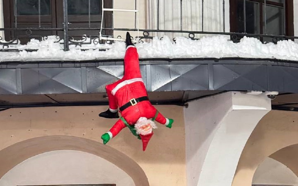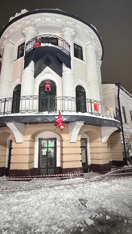 На кадрах видно, что один из Сант, размещенных на балконах здания, висит вниз головой, зацепившись ногой за перила.