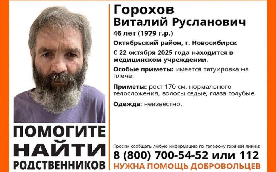 Виталию Руслановичу Горохову 46 лет, он находится в медицинском учреждении с конца октября прошлого года. Рост - 170 см; седой, голубоглазый. На плече у мужчины есть татуировка.
